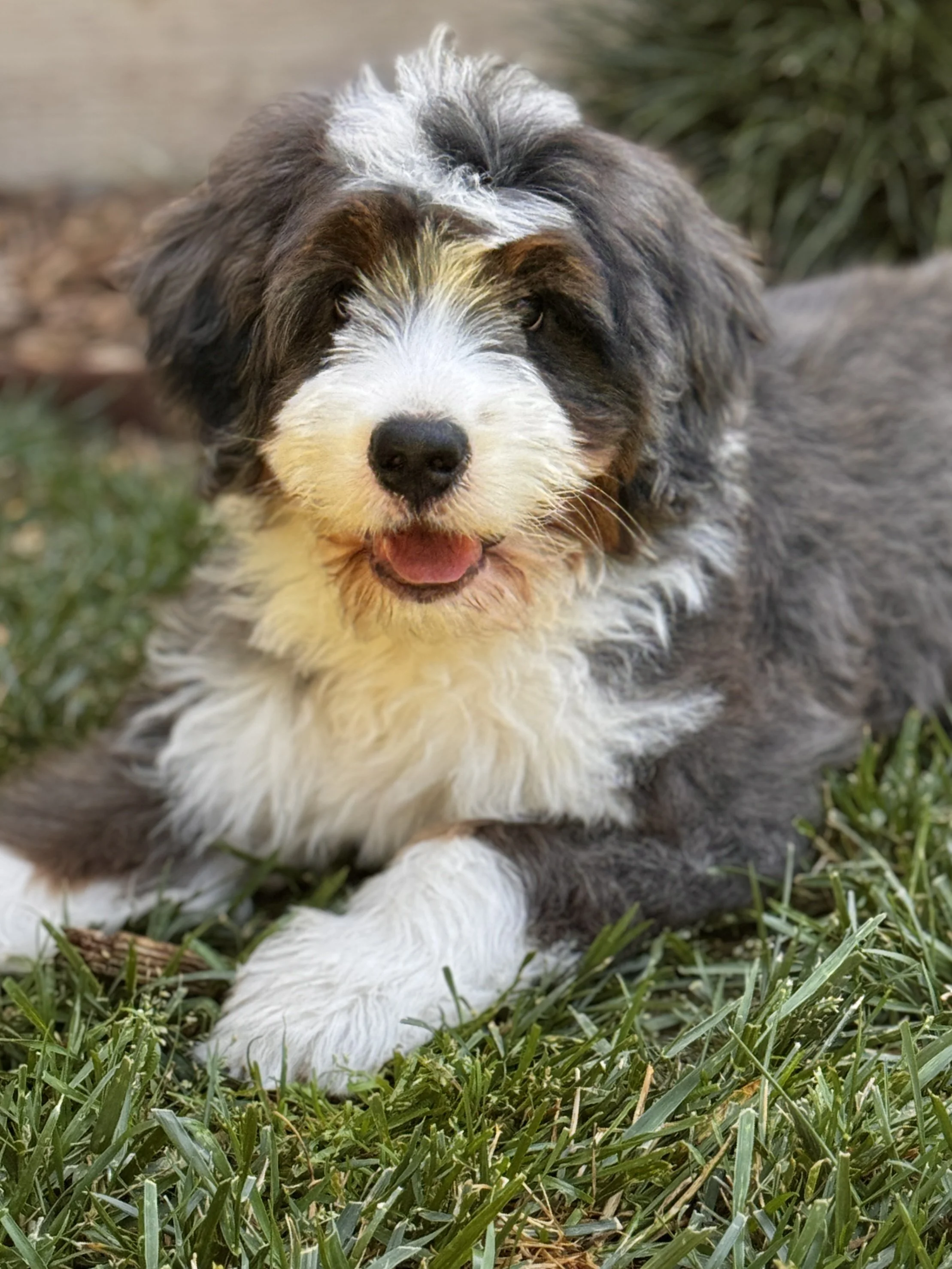 Acorn is an Ultra Bernedoodle expected to mature in the 50-55 pound range. Acorn has the most beautiful blue merle coat with rich, deep red points.